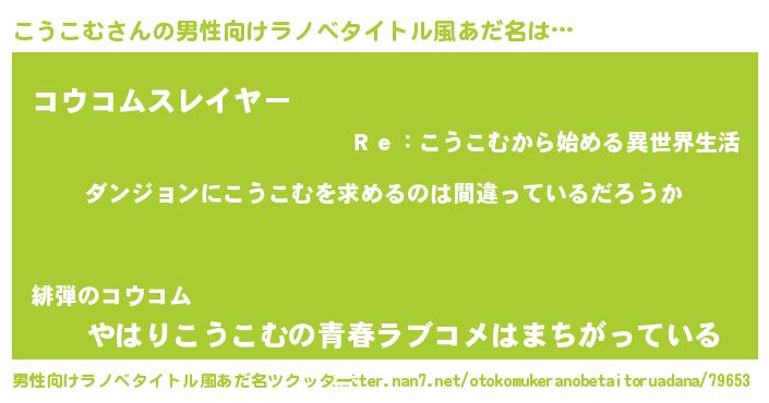 | 胡散臭い通販商品みたいなあだ名 | 『信頼と実績のサプリメント…その名も「こうこむ」』 |