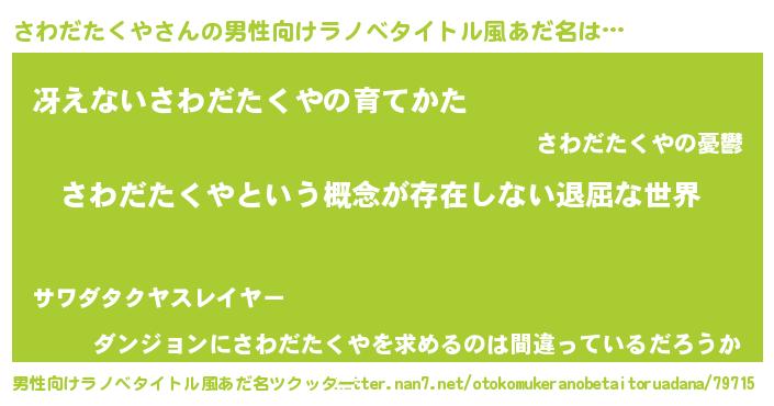 | 女子向けラノベタイトル風あだ名 | 『異世界で失敗しない100のさわだたくや』 |