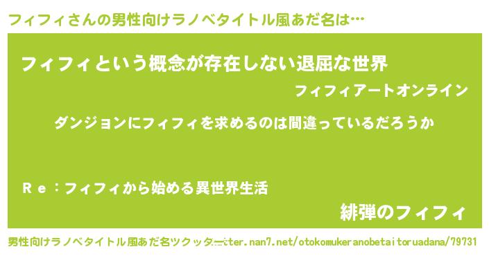 | 女子向けラノベタイトル風あだ名 | 『フィフィの卵を拾いまして』 |