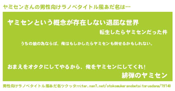 | 女子向けラノベタイトル風あだ名 | 『ヤミセンの婚約者』『ヤミセン恋絵巻』 |