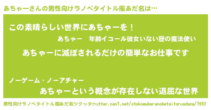 | 意味不明あだ名 | 『住所不定無職あちゃー(81歳)』 |