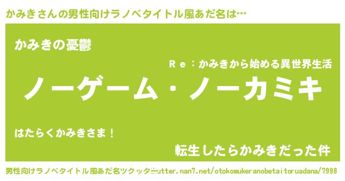 | 女子向けラノベタイトル風あだ名 | 『死神かみきの再婚』 |
