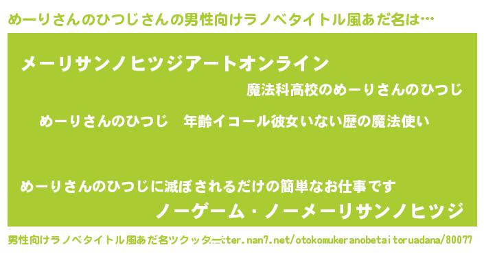 | 女子向けラノベタイトル風あだ名 | 『めーりさんのひつじの玉の輿計画!』 |
