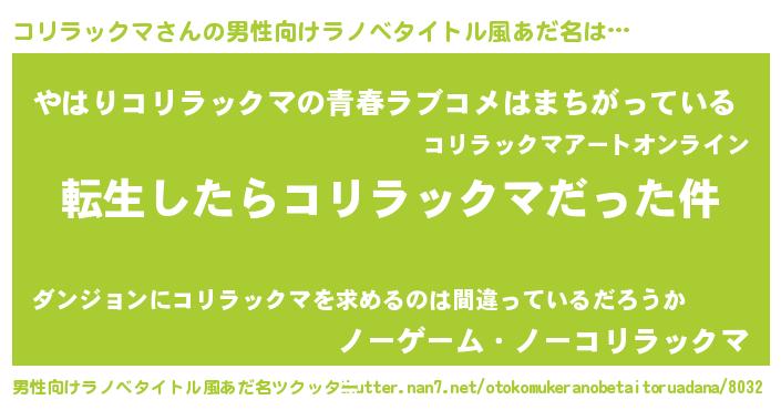 | 女子向けラノベタイトル風あだ名 | 『婚約破棄系悪役コリラックマに転生したので、保身に走りました。』 |