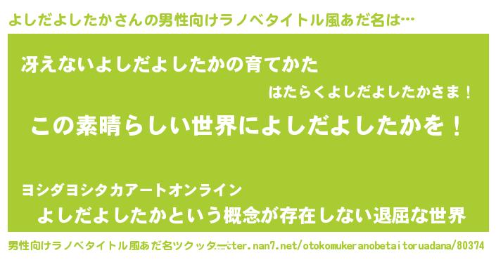| 女子向けラノベタイトル風あだ名 | 『悪役よしだよしたかに転生したようですが、知った事ではありません』 |