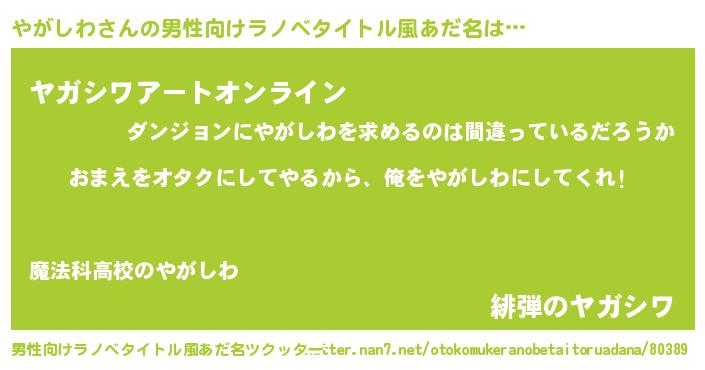 | ヒーロー風カッコイイあだ名 | 『友情の使者やがしわ』『魔戒騎士ヤガ』 |
