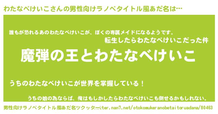 | 女子向けラノベタイトル風あだ名 | 『わたなべけいこが死なない童話 林檎のわたなべけいこの診療簿』 |