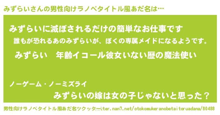 | 女子向けラノベタイトル風あだ名 | 『みずらいの玉の輿計画!』 |