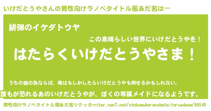 | 胡散臭い通販商品みたいなあだ名 | 『来世でも幸せになれる健康食品…その名も「いけだとうや」』 |