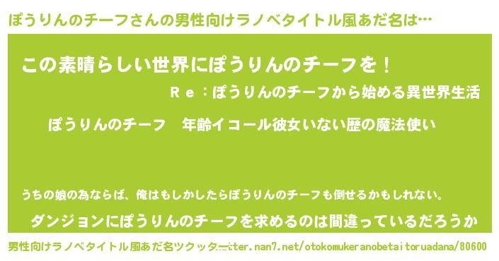 | 胡散臭い通販商品みたいなあだ名 | 『あなたにだけ特別に提供する限定10本のレアな日本酒…その名も「ぽうりんのチーフ」』 |
