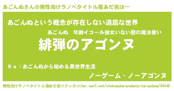 | 胡散臭い通販商品みたいなあだ名 | 『絶対に幸福をもたらす水素水…その名も「あごんぬ」』 |