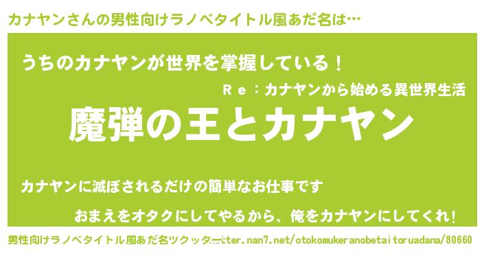 | 女子向けラノベタイトル風あだ名 | 『乙女ゲームの破滅フラグしかない悪役カナヤンに転生してしまった…』 |