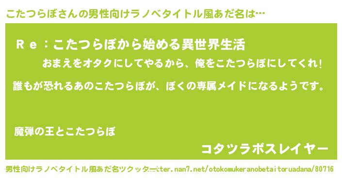 | ヒーロー風カッコイイあだ名 | 『ネオコタツラボ』『最強戦士コタツラボ』 |