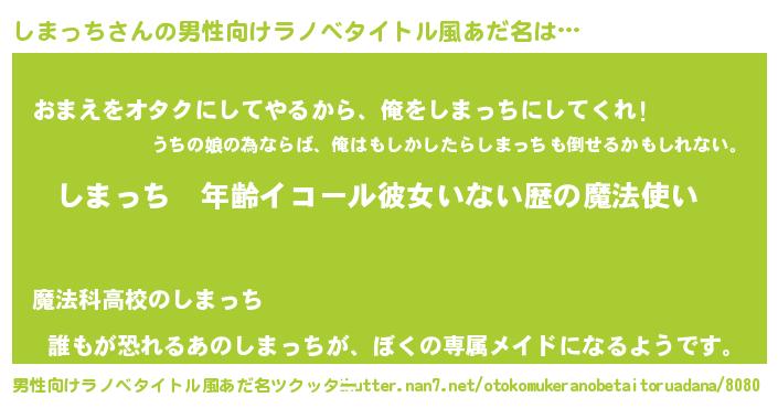 | 女子向けラノベタイトル風あだ名 | 『しまっちの玉の輿計画!』 |