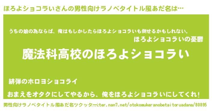 | 女子向けラノベタイトル風あだ名 | 『ほろよショコラいなんてお断りですっ。』 |