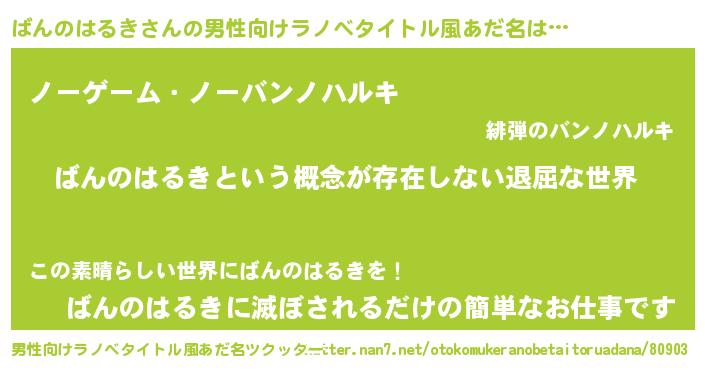 | 女子向けラノベタイトル風あだ名 | 『ばんのはるきの契約王妃』 |