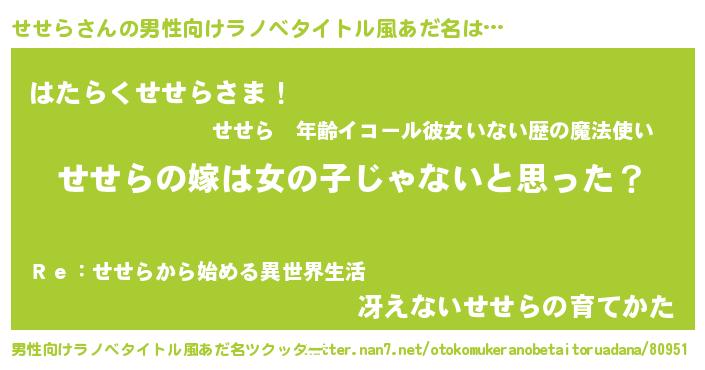 | 女子向けラノベタイトル風あだ名 | 『せせら様がみてる』 |