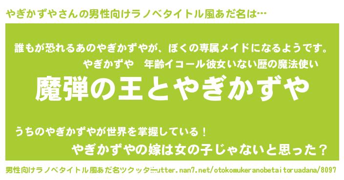 | 女子向けラノベタイトル風あだ名 | 『やぎかずやが死なない童話 林檎のやぎかずやの診療簿』 |