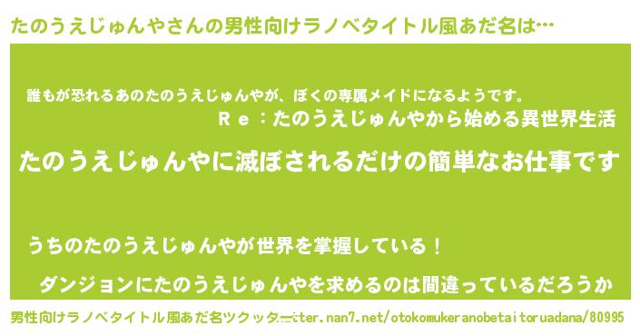 | 胡散臭い通販商品みたいなあだ名 | 『前代未聞の健康食品…その名も「たのうえじゅんや」』 |