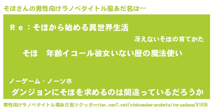 | 女子向けラノベタイトル風あだ名 | 『そほの玉の輿計画!』『闇のそほ』 |