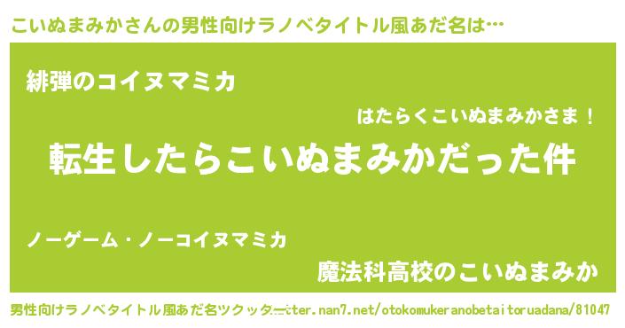 | 女子向けラノベタイトル風あだ名 | 『こいぬまみかの玉の輿計画!』 |