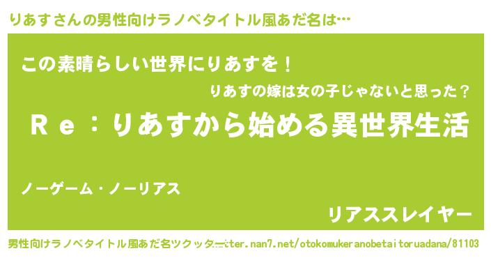 | 女子向けラノベタイトル風あだ名 | 『闇のりあす』『りあす様がみてる』 |