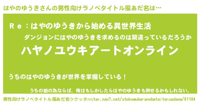 | 女子向けラノベタイトル風あだ名 | 『誰かこのはやのゆうきを説明してください! ~契約から始まるウェディング~』 |