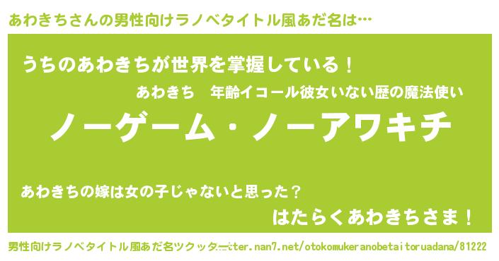 | 女子向けラノベタイトル風あだ名 | 『死神あわきちの再婚』 |