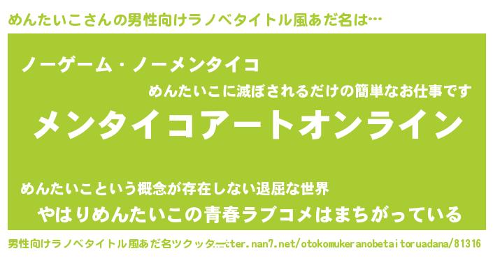 | 胡散臭い通販商品みたいなあだ名 | 『億万長者になれるブレスレット…その名も「めんたいこ」』 |