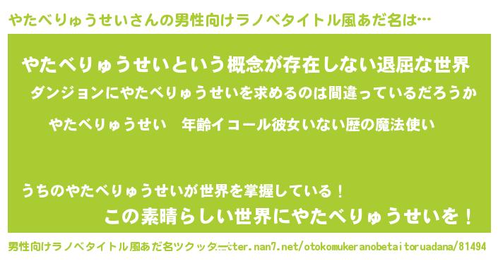 | 女子向けラノベタイトル風あだ名 | 『やたべりゅうせいの玉の輿計画!』 |