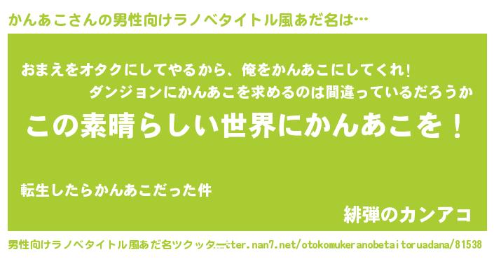 | 女子向けラノベタイトル風あだ名 | 『乙女ゲームの破滅フラグしかない悪役かんあこに転生してしまった…』 |