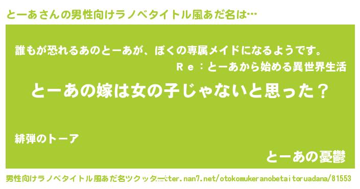 | 女子向けラノベタイトル風あだ名 | 『とーあ様がみてる』『とーあの契約王妃』 |