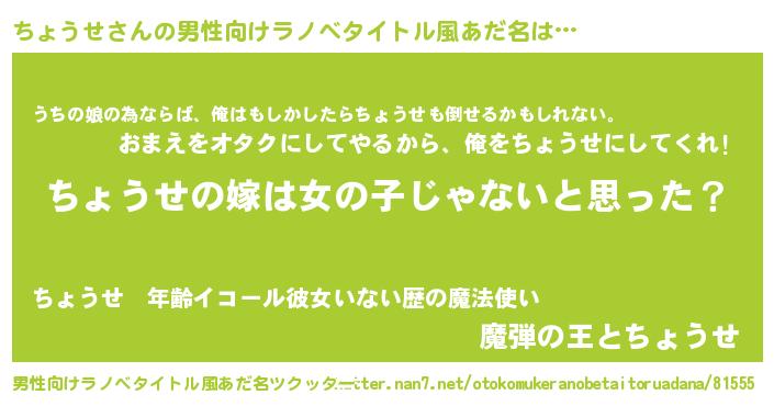 | 女子向けラノベタイトル風あだ名 | 『ちょうせの卵を拾いまして』 |