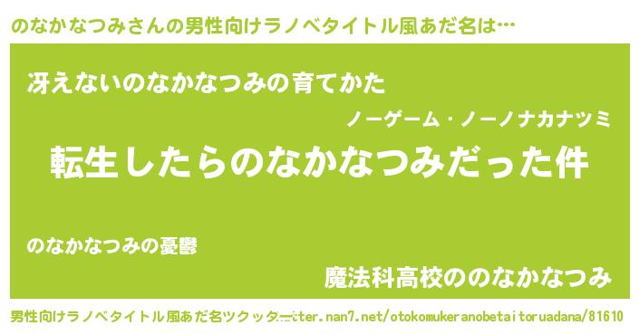 | 女子向けラノベタイトル風あだ名 | 『婚約破棄系悪役のなかなつみに転生したので、保身に走りました。』 |