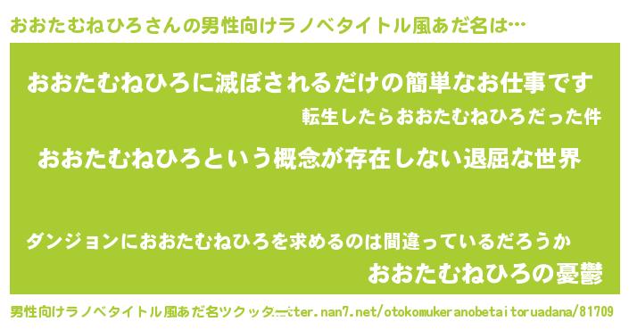 | 女子向けラノベタイトル風あだ名 | 『異世界で失敗しない100のおおたむねひろ』 |