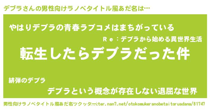 | 女子向けラノベタイトル風あだ名 | 『婚約破棄系悪役デブラに転生したので、保身に走りました。』 |