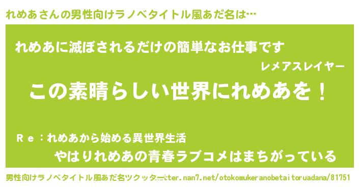 | ヒーロー風カッコイイあだ名 | 『仮面レメダー』『ウルトラれめあマン』 |