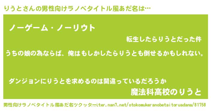 | 女子向けラノベタイトル風あだ名 | 『りうとの婚約者』『死神りうとの再婚』 |