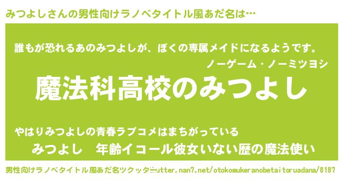 | 女子向けラノベタイトル風あだ名 | 『みつよしなんてお断りですっ。』 |