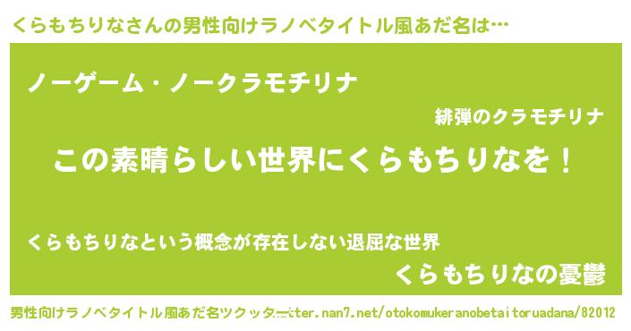 | 胡散臭い通販商品みたいなあだ名 | 『あなたにだけ特別に提供する限定10本のレアな日本酒…その名も「くらもちりな」』 |