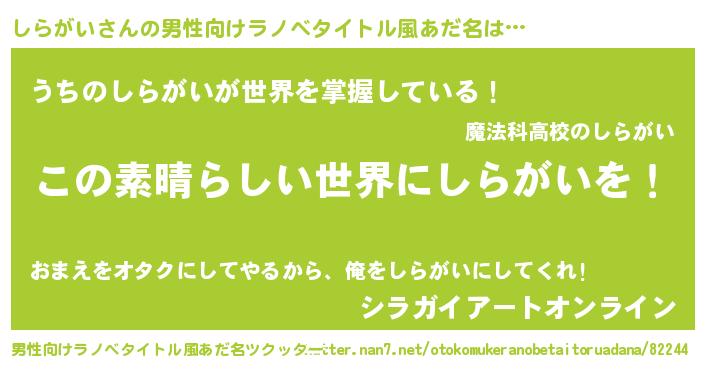 | 女子向けラノベタイトル風あだ名 | 『乙女ゲームの破滅フラグしかない悪役しらがいに転生してしまった…』 |