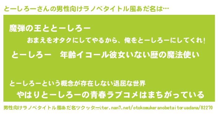 | 胡散臭い通販商品みたいなあだ名 | 『あなたにだけ特別に提供する100年もののヴィンテージワイン…その名も「とーしろー」』 |