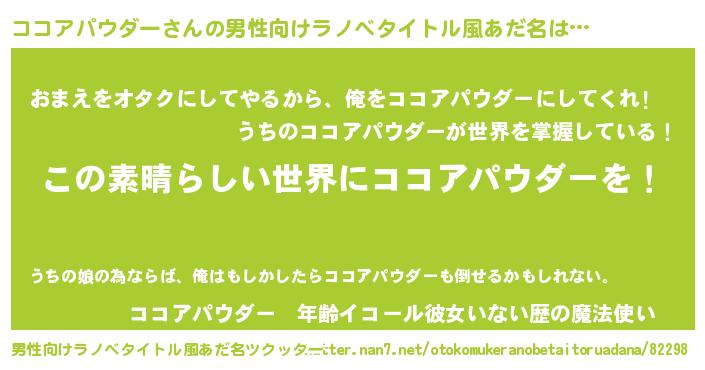 | 女子向けラノベタイトル風あだ名 | 『悪役ココアパウダーに転生したようですが、知った事ではありません』 |