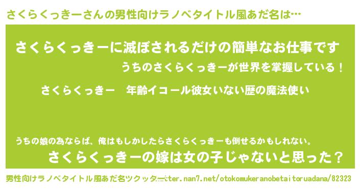 | 女子向けラノベタイトル風あだ名 | 『さくらくっきーの玉の輿計画!』 |