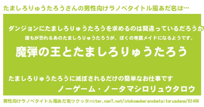 | 女子向けラノベタイトル風あだ名 | 『たましろりゅうたろうが死なない童話 林檎のたましろりゅうたろうの診療簿』 |