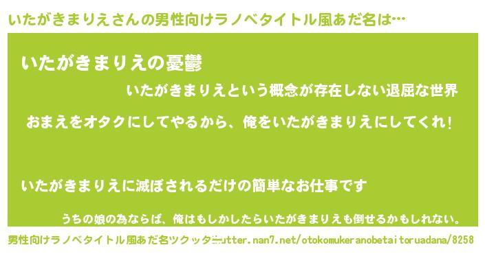| 胡散臭い通販商品みたいなあだ名 | 『お金では代えられないイリジウム磁石…その名も「いたがきまりえ」』 |