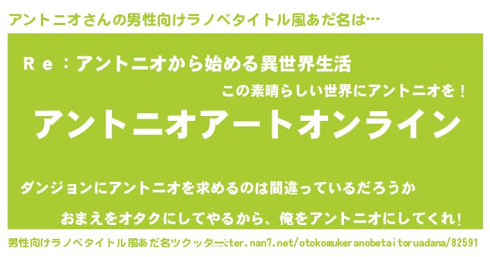 | 女子向けラノベタイトル風あだ名 | 『誰かこのアントニオを説明してください! ~契約から始まるウェディング~』 |