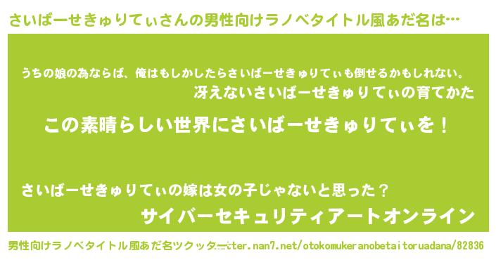 | 胡散臭い通販商品みたいなあだ名 | 『あなたにだけ特別に提供する限定10本のレアな日本酒…その名も「さいばーせきゅりてぃ」』 |