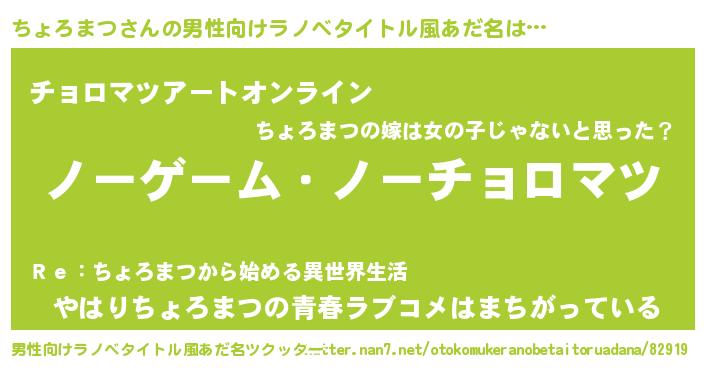| 女子向けラノベタイトル風あだ名 | 『死神ちょろまつの再婚』 |