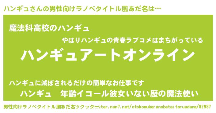 | 女子向けラノベタイトル風あだ名 | 『誰かこのハンギュを説明してください! ~契約から始まるウェディング~』 |